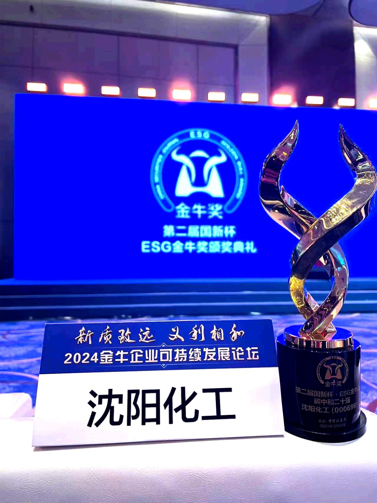 12月6日,由《中國證券報》攜手中國國新控股有限責任公司旗下國新咨詢有限責任公司聯合舉辦的“新質致遠 義利相和——2024金牛企業(yè)可持續(xù)發(fā)展論壇”暨“第二屆國新杯·ESG金牛獎頒獎典禮”在上海圓滿落幕,沈陽化工股份有限公司(以下簡稱“沈陽化工”)在此次頒獎典禮上榮獲“國新杯·ESG金牛獎碳中和二十強”獎項。這是公司繼去年獲得“第一屆國新杯·ESG金牛獎碳中和五十強”獎項后,再次獲得的ESG殊榮。